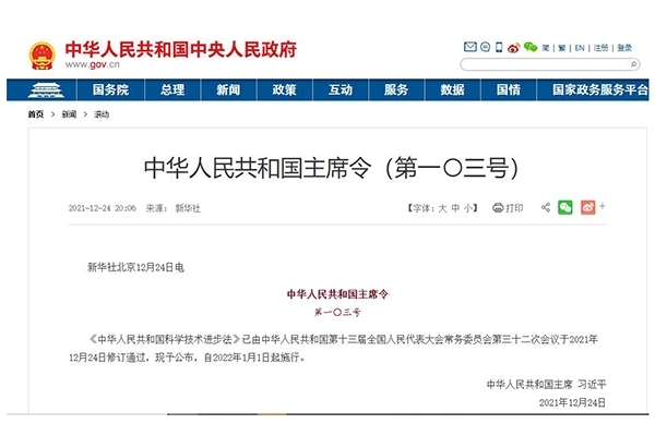 2021年12月24日,中華人民共和國第十三屆全國人民代表大會常務委員會第三十二次會議修訂通過了《中華人民共和國科學技術進步法》。自2022年1月1日起施行。